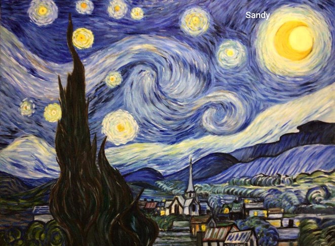 Although partly due to a commission someone could not finish and as part of Geraldine Gustavino’s Saturday Sessions a few of the ASA members have had a go at replicating Van Gogh’s work “Starry Night”. Amazing job Diane Miles, Sandy Spindler, Geraldine Gustavino and Jane Meleisea!